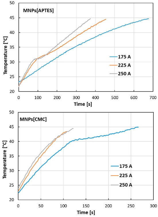 At the given current intensities, the temperature generated by nanoparticles under the influence of an external electromagnetic field increases over time, as shown in Figure 5. The results indicate significant hyperthermal properties of the tested nanostructures, whereby MNPs[CMC] are stronger than MNPs[APTES]. For example, at a current of 250 A, MNPs[APTES] generate a temperature increase to 45 °C after about 370 s, while MNPs[CMC] raise the temperature to the same value after about 120 s.