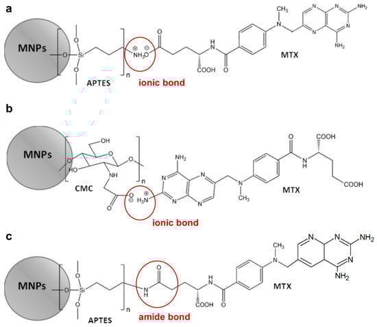 Illustrative schemes of methods for attaching MTX to magnetic nanoparticles functionalized with APTES and CMC are illustrated in Figure 6.