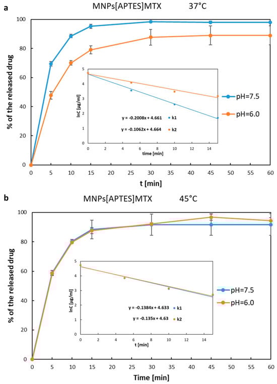 MTX release curves from MNPs[APTES]. Internal graphs present sections corresponding to first-order kinetics representing the equation lnC = −kt + lnC0, where C0 is the concentration corresponding to the initial amount of MTX on the nanoparticles (t = 0), while C is the drug concentration corresponding to the amount of the drug on the MNPs after the release time t. The slopes indicate the release rate constants: (a) k1—release constant for 37 °C, pH = 7.5; k2—release constant for 37 °C, pH = 6.0; (b) k1—release constant for 45 °C, pH = 7.5; k2—release constant for 45 °C, pH = 6.0. The experiments were repeated at least three times.