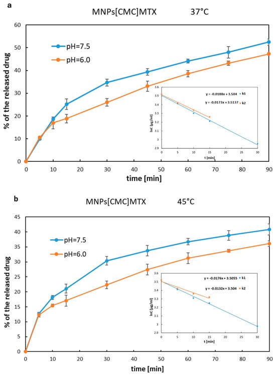 MTX release curves from MNPs[CMC]. The internal graphs present sections corresponding to first-order kinetics representing the equation lnC = −kt + lnC0, where C0 is the concentration corresponding to the initial amount of MTX on the nanoparticles (t = 0), while C is the drug concentration corresponding to the amount of the drug on the MNPs after the release time t. The slopes indicate the release rate constants: (a) k1—release constant for 37 °C, pH = 7.5; k2—release constant for 37 °C, pH = 6.0; (b) k1—release constant for 45 °C, pH = 7.5; k2—release constant for 45 °C, pH = 6.0. The experiments were repeated at least three times.