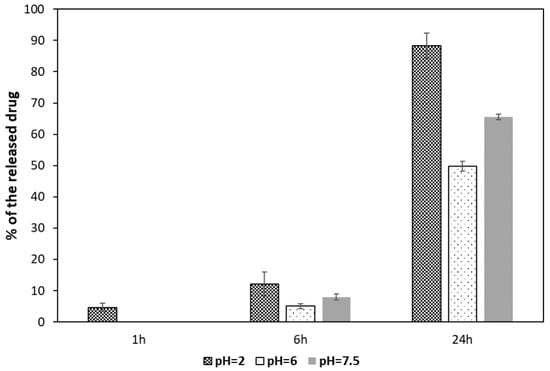 The release of MTX bound on nanoparticles via an amide bond was performed at three pH values: 7.5, 6.0, and 2.0, which reflect the environmental conditions of blood serum, tumor intercellular matrix, and intracellular lysosomes, respectively. A common phenomenon in tumours is ion pump disruption []. Cancer cells remove H+ ions to a greater extent than normal cells, which causes an increase in pH inside cells and a decrease in the extracellular matrix. In turn, in intracellular lysosomes, which during normal cellular metabolism are responsible for the breakdown of proteins and other exogenous materials, the pH is very low. Following receptor-mediated endocytosis, nanoparticles are transported to early endosomes, fusing with lysosomes.