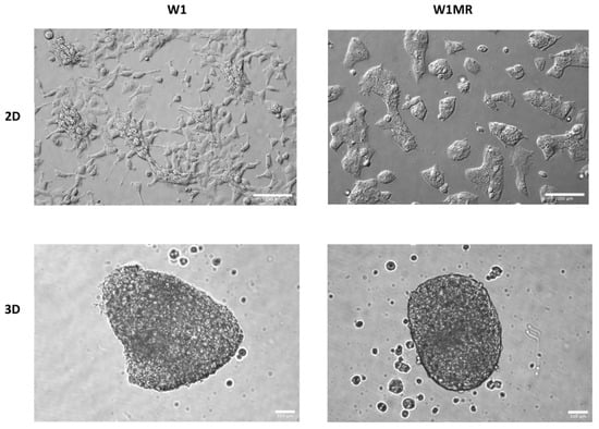 Morphology of drug-sensitive W1 and methotrexate-resistant W1MR cell lines growing in 2D and 3D cell culture conditions. Scale bar = 100 µm.