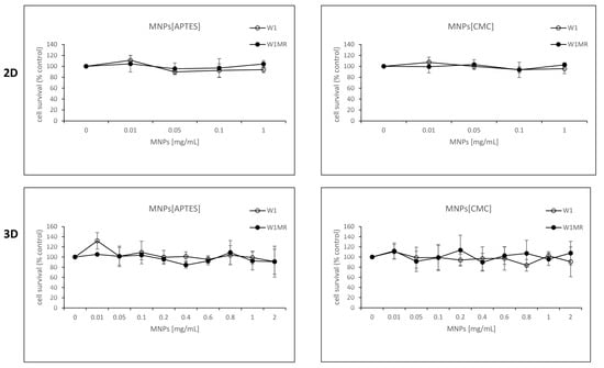 Survival assay of MTT cells in 2D and 3D cell culture conditions. Cell lines W1 and W1MR were seeded at a density of 10,000 cells/well in 96-well plates and treated with increasing concentrations of MNPs[APTES] or MNPs[CMC] at 37 °C for 72 h and cell viability was determined. The experiments were repeated at least three times. The level of viability is shown as a percentage of untreated control cells (mean ± SEM).