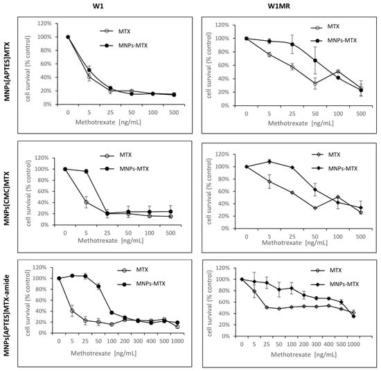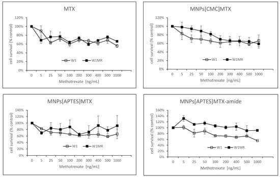 Survival assay of MTT cells in a 2D cell culture condition. Cell lines W1 and W1MR were seeded at a density of 10,000 cells/well in 96-well plates and treated with increasing concentrations of free MTX and conjugated with nanoparticles MNPs[CMC]MTX, MNPs[APTES]MTX or MNPs[APTES]MTX-amide at 37 °C for 72 h and cell viability was determined. The experiments were repeated at least three times. The level of viability is shown as a percentage of untreated control cells (mean ± SEM).