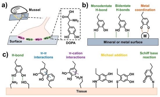 Adhesion of mussel-inspired materials. (a) The adhesion of marine mussels by adhesive plaques composed of DOPA. (b) The interactions of catechol group with mineral or metal surfaces. (c) The interactions of catechol group with biological tissue surfaces [9,12].