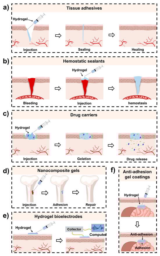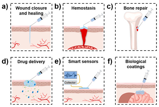 Biomedical applications of mussel-inspired injectable adhesive hydrogels. (a) Wound closure and healing; (b) Hemostasis; (c) Bone repair; (d) Drug delivery; (e) Smart sensors; (f) Biological coatings.