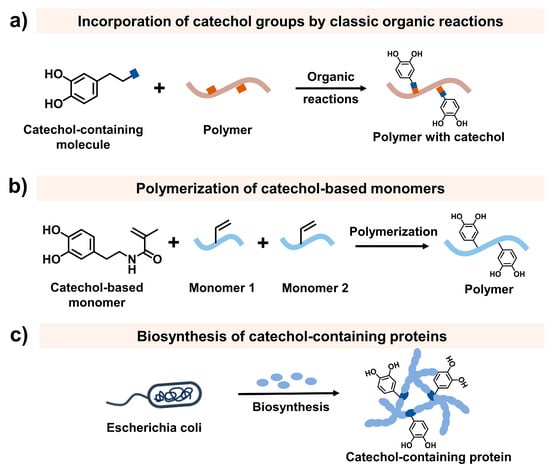 Typical strategies for incorporation of catechol groups into polymers. (a) Incorporation of catechol group by classic organic reactions. (b) Polymerization of catechol-based monomers. (c) Biosynthesis of catechol-containing proteins.