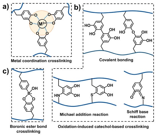 Catechol-mediated crosslinking [2,3,5]. (a) Catechol–metal coordination crosslinking. (b) Oxidation-induced catechol-based crosslinking. (c) Dynamic boron ester-based crosslinking.