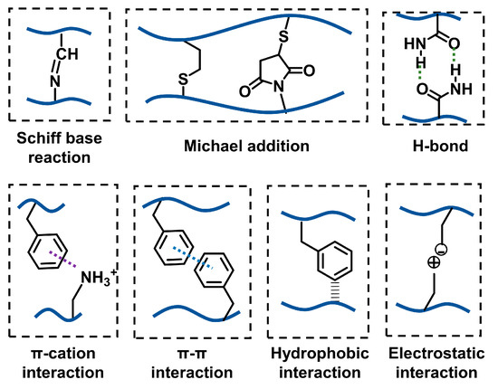 Noncovalent interactions are frequently introduced in the design of mussel-inspired adhesive hydrogels. Interactions, including hydrogen bonding, π-π stacking, cation-π interactions, electrostatic forces, and hydrophobic effects, are frequently employed to create self-healable hydrogel networks [3,51]. Compared with covalent bonds, noncovalent interactions are usually weak [71]. Therefore, noncovalent interactions usually work with covalent crosslinking. The introduction of noncovalent interactions into the gel network not only enhances the structural integrity of the hydrogel networks but also endows these materials with additional characteristics, such as self-healing capabilities [72].