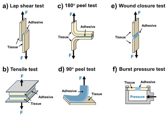 Methods of evaluation of the adhesive performance. (a) Lap shear test; (b) Tensile test; (c) 180° peel test; (d) 90° peel test; (e) Wound closure test, and (f) Burst pressure test.