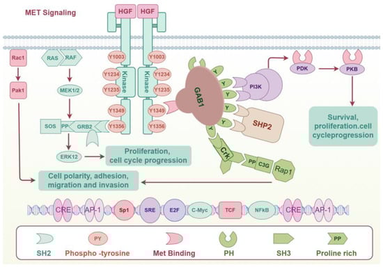 When HGF binds to c-MET, it causes c-MET to homodimerize and its intracellular kinase domains to undergo trans-phosphorylation., which occurs mainly at several tyrosine residues in the intracellular tail of MET, including Y1234 and Y1235 (key sites in the activation loop) and Y1349 and Y1356 (multifunctional docking sites) []. Phosphorylated tyrosine residues (especially Y1349 and Y1356) provide binding sites for a range of signaling molecules [], including GRB2 (growth factor receptor-bound protein 2), GAB1 (GRB2-associated-binding protein 1), PI3K (Phosphatidylinositol 3-kinase), PLCγ (Phosphatidylinositol-specific phospholipase Cγ), and STAT3. These signaling molecules recognize and bind to phosphorylated tyrosine residues through the specific SH2 domain (Src homology 2 structural domain) []. Signaling molecules bound to MET receptors further activate various downstream signaling pathways, including Ras-MAPK, PI3K-AKT, STAT, β-strand integrins, and GAB1-mediated signaling pathways. These pathways influence a range of biological processes, encompassing cell proliferation, migration, survival, morphological changes, and differentiation [,] (Figure 1).