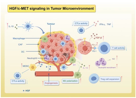 In addition to regulating T cells, HGF/c-MET signaling also regulates the function and infiltration of immunosuppressive cells. These cells include tumor-associated neutrophils, tumor-associated macrophages, tumor-associated dendritic cells, myeloid-derived suppressor cells, and regulatory T cells (Tregs). They inhibit the immune response against tumor cells and facilitate tumor immune escape. As crucial components of the tumor immunosuppressive microenvironment, these cells impede the efficacy of antitumor therapy [].