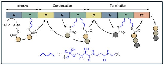 NRPSs are large complexes composed of adenylation (A), thiolation (T), and condensation (C) domains. Non-ribosomal peptides are synthesized through sequential enzymatic reactions: the A domain activates and attaches amino acids (colored circles) to the T domain, initiating biosynthesis by forming a thioester bond with Ppant (blue). The C domain then forms peptide bonds between modules. During termination, the thioesterase (TE) domain hydrolyzes the bond between the T domain and the peptide, releasing the final peptide product.