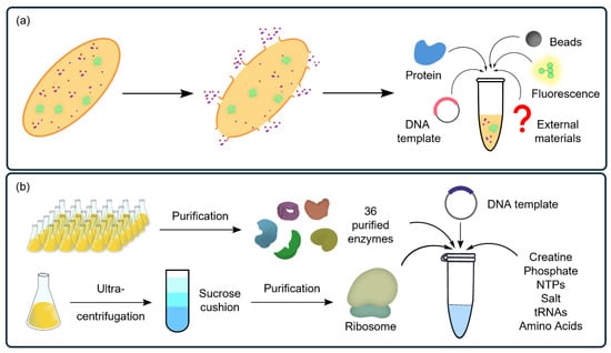 - Shimizu, Y.; Inoue, A.; Tomari, Y.; Suzuki, T.; Yokogawa, T.; Nishikawa, K.; Ueda, T. Cell-free translation reconstituted with purified components. Nat. Biotechnol. 2001, 19, 751–755. [Google Scholar] [CrossRef] [PubMed]