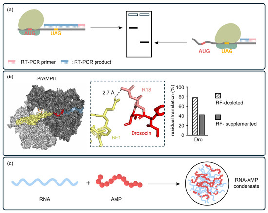 Cell-free systems as ideal platforms for elucidating the intracellular mechanisms of the antimicrobial action of PBAs. (a) In a reconstituted cell-free system, deleterious enzymes (e.g., RNases, DNases, and proteases) that could reduce protein production are excluded. This allows for the use or synthesis of short DNAs, RNAs, or peptides. The toe-printing technique, which utilizes ribosome stalling, helps identify the PBA mechanisms that inhibit ribosome polymerization. The platform enables the identification of inhibited translation stages in the discovery process, especially if the PBAs target the large subunit of ribosomes. (b) The inhibition mechanism of type II PrAMPs (drosocin) is elucidated on a cell-free platform by selectively adding or removing RF1. Cryo-EM analysis shows that drosocin binds to the exit tunnel of the ribosome and interacts with RF1 located in the A-site (exit tunnel of the ribosome: blue, drosocin: red, RF1: yellow), inhibiting translation efficiency by approximately 50%. (c) The capability to form biomolecular condensates (RNA and PBA) via phase transitions is the origin of bactericidal activity.
