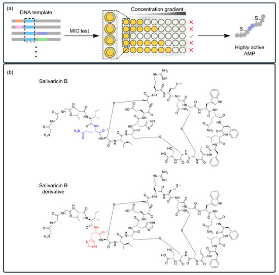 Screening for salivaricin B synthesis and its derivatives obtained from the selection process. (a) Genome mining and screening platforms enable the production of a library containing mutations at multiple sites of the wild-type salivaricin B structure. The enzyme-binding sites (light blue) revealed via genome mining remained intact during mutagenesis. Using cell-free protein synthesis platforms, a novel salivaricin B derivative with high antimicrobial activity (green √) against gram-negative bacteria was discovered. (b) Through a selection process from a library containing numerous derivatives, a new salivaricin B derivative with 4-fold enhanced efficacy was found to contain a histidine residue (red).