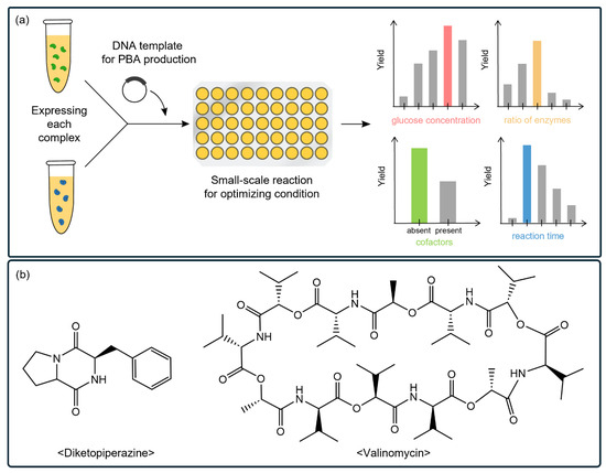 CFSs for screening targeted PBAs. (a) Biosynthesis of NRPs using NRPSs requires precise reaction conditions to achieve high yields. NRPS modules are produced separately and combined into a multi-well plate to identify optimal reaction conditions, such as glucose concentration, NRPS ratios, cofactors (NAD, CoA, and ATP), and reaction time. (b) Molecular structures of diketopiperazine and valinomycin are produced efficiently by optimizing synthetic conditions using a CFS.