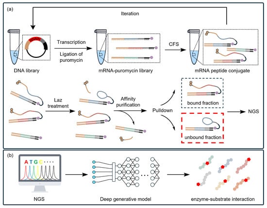 Returning to the identification of the minimal lactazole (a type of RiPP) scaffold discussed in the previous section, Vinogradov et al. further explored expanding the range of substrates acceptable for the enzymes used in lactazole biosynthesis [171,172]. Using a reactivity-profiling mRNA display assay, which establishes a genotype–phenotype link through mRNA display techniques and indirectly identifies amino acid sequences via sequencing the conjugated mRNA [171], the authors identified alternative substrate preferences in the biosynthetic pathway (Figure 7a). Subsequently, amino acid sequences scored by next generation sequencing (NGS) were used to train a deep generative model that generated a diverse array of lactazole-forming sequences based on minimal lactazole scaffolds. This assay not only confirmed known aspects of lactazole biosynthesis but also provided new insights into enzyme fitness, enabling the construction of combinatorial thiopeptides, and leveraging the capabilities of CFSs for high-throughput analysis. The model also predicted the promiscuity of lactazole RiPP enzymes, aiding in the design of thiopeptide derivatives (Figure 7b).