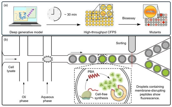 Diverse platforms using CFSs for screening PBAs. (a) To design PBAs de novo for new drug discovery, a deep generative model is integrated with a CFS. The model prioritizes potential PBAs and predicts target PBAs with higher accuracy. In the experimental pipeline, PBAs are rapidly synthesized from a synthetic DNA template in the CFS and directly tested against bacterial cultures. Notably, the six newly discovered de novo-designed PBAs exhibit antimicrobial activity against a wide spectrum of multidrug-resistant pathogens. (b) Microfluidic systems that generate multiple droplets containing different PBAs provide an efficient way to identify new PBAs with high membrane disruption activity. A self-quenching dye is embedded in a vesicle, which is further encapsulated in bacteria-like lipid vesicles. Increased fluorescence indicates that the PBA disrupts the inner vesicle, resulting in the dilution of the self-quenched dye within the droplet.