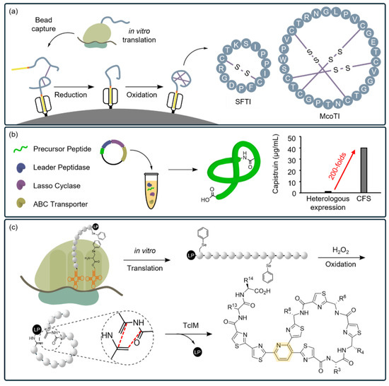 The most common covalent bond providing structural stability in nature is the disulfide bond formed between the thiol groups of cysteine residues [78]. Wu et al. recently introduced a method to improve the folding and reduce the aggregation of disulfide-rich peptides and proteins produced in vitro (Figure 9a) [153]. They used a modified E. coli-based CFS to enable the co-translational capture of peptides using an affinity matrix. This facilitated accurate oxidative folding through disulfide bonds and recycling of misfolded states. This approach enhances the yield (4~5-fold) of peptides with complex macrocyclic architectures and multiple disulfide bonds, indicating that CFSs could be applied to various peptides that need to maintain their structure under denaturing conditions, such as high temperature, acids, or bases.