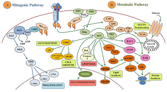 After insulin binds to its receptor, the insulin receptor substrate (IRS) molecules are attracted to the receptor through receptor autophosphorylation (Figure 1). Two types of IRS, namely IRS-1 and IRS-2, have so far been shown to be important in the transmission of insulin action [55,56]. These molecules are phosphorylated on their tyrosine residues by the autophosphorylated insulin receptor, the activation of which then mediates diverse downstream signaling events through either the mitogenic or metabolic pathways as shown in Figure 1 [44,57].