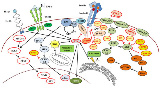 Main pathways involved in the development of insulin resistance. Intrinsic ((A)—ER stress) and extrinsic ((B)—tumor necrosis factor α (TNFα) receptor agonists) factors as well as inhibitory proteins involved in the progression of IR, among others, e.g., oxidative stress. Arrow: activation, Truncated arrow: inhibition. See further explanation in text.