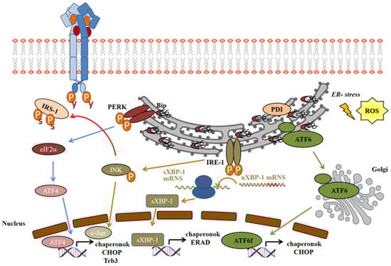 - On the IRE-1 pathway, activating phosphorylation of IRE-1α leads to the recruitment of tumor necrosis factor receptor-associated factor 2 (TRAF2), which then activates apoptosis signal-regulating kinase 1 (ASK1) and the stress-activated c-Jun N-terminal kinase (JNK) [111]. JNK then inactivates the insulin signaling by serine phosphorylation of IRS-1 (Figure 3), as well as inducing apoptosis, while inhibiting autophagy [103]. IRE-1α has endonuclease activity as well, which cleaves 26 base–pair sequences from the mRNA of X-box binding protein-1 (XBP1). This spliced variant sXBP-1 is facilitating the transcription of chaperons to enhance the folding capacity of ER. The misfolded proteins are removed from the ER, ubiquitinated, and transferred to proteasomal degradation; this process is called endoplasmic reticulum-associated degradation (ERAD). sXBP-1 also induces factors involved in ERAD to facilitate damaged protein clearance from ER lumen [109,112].