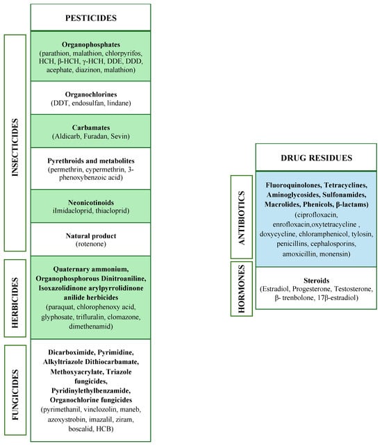 Pesticides and drug residues object of the study. Schematic representation of the classes of pesticide and drug residues analyzed in this review.