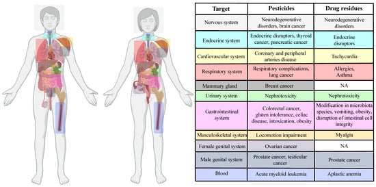 Recent studies reveal that repeated exposure to drug residues and pesticides may lead to several pathological conditions [], exposing humans to the increased risk of developing neurodegenerative disorders, endocrine disruptors, respiratory complications, reproductive disorders and birth defects and cancer [,,,,,,,] (Figure 3).