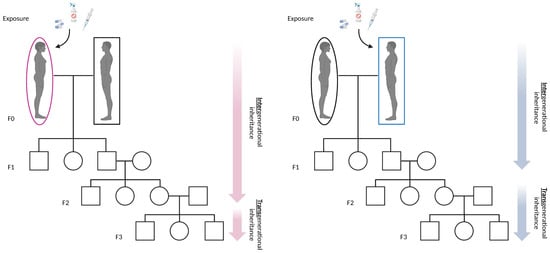 Exposure to environmental agents can induce epigenetic modifications in germ cells that can be passed to the progeny through successive generations causing intergenerational or transgenerational inheritance. Intergenerational inheritance generally occurs when a non-genetic modification is transmitted from exposed germ cells to their progeny. Conversely, transgenerational effects occur when germ cells not directly exposed to the environmental agents transfer the non-genetic modification to their progeny (Figure 5).