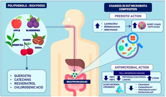 Emerging scientific evidence has ascribed prebiotic properties to polyphenols, emphasizing their ability to promote the growth of beneficial gut bacteria such as Lactobacillus, Bifidobacterium, and Akkermansia. These beneficial bacteria contribute to increased short-chain fatty acids (SCFAs) and overall host health []. Additionally, polyphenols exhibit antibacterial activity by suppressing the growth of pathogenic bacteria, including Clostridium, Staphylococcus, Enterococcus, Campylobacter, H. pylori, and Escherichia coli, through damage to their cell membranes [].
