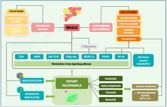 Research into the pathogenesis of MASLD has spurred curiosity, with its intricate mechanisms lacking definitive conclusions. The classic “two-hit theory” highlights lipid metabolism disorder and insulin resistance, fostering hepatic fat buildup []. Evolving into the “multiple-hit” theory, oxidative stress, lipid peroxidation, and aberrant cytokines provoke inflammation, fostering liver fibrosis and cirrhosis []. Key factors encompass lipid accumulation, insulin resistance, oxidative stress, and inflammatory response intertwined with diverse signaling pathways. Phenolic compounds offer promise by modulating key signaling pathways such as NF-κB, AMPK, JAK/STAT, PPARs, SREBP-1c, PI3K/Akt, and TLRs [,]. By targeting these pathways, phenolic compounds may mitigate lipid accumulation, insulin resistance, oxidative stress, and inflammatory responses, thus presenting a compelling avenue for MASLD prevention and treatment within the cardiometabolic context (Figure 2).