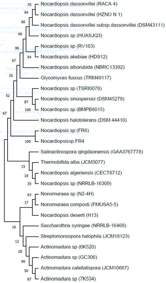A search in GenBank showed the presence of a large number of homologous proteins. Twenty-eight proteins had at least 80% homology and their amino acid sequences were aligned (Figure 1). The closest homology of 85.9% was with the protein from Nocardiopsis sp. FR6. Each of the proteins contains a TAT signal peptide, a GH11 catalytic domain, and a CBM2 polysaccharide binding domain. Identical amino acids are located mainly in GH11 and CBM2. Actinobacteria Actinomadura sp. 6K520 contains a single amino acid insertion in the GH11 domain. Deletions and insertions of amino acids occur mainly in the TAT signal peptide and interdomain linker. Phylogenetic analysis showed that proteins within genus Nocardiopsis are closer to each other (Figure 2), except for the protein from Glycomycesfuscus, which showed high similarity to the proteins from Nocardiopsis. At the same time, the protein from Nocardiopsis deserti showed similarity with proteins from genera Actinomadura and Nonomuraea, which form a separate group. The homologous proteins have not been studied previously, so it cannot be said that their properties are similar to endo-1,4-β-xylanase from N. halotolerans.