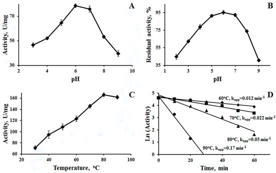The NhX1 protein was purified to an electrophoretically homogeneous state (Figure 3C). Its properties were then studied. The enzyme catalyzed the hydrolysis of xylan with a specific activity of 89 U/mg. The NhX1 enzyme did not catalyze the hydrolysis of amorphous cellulose, CM-cellulose, beta-glucan, lichenin, or starch. The optimal pH value for xylan hydrolysis was in the neutral region and amounted to 6.0–7.0 (Figure 4A). At the same time, in the acidic (less than 3.0) and alkaline (more than 9.0) pH ranges, NhX1 activity decreased and was less than 50% of the maximum. The NhX1 enzyme was more stable in the neutral, slightly acidic and slightly alkaline pH ranges (Figure 4B). Neutral xylanases were previously found in actinobacteria []. Xylanases with alkaline and acidic pH optimums are also known [,].