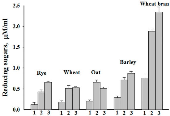 Formation of reducing sugars under the action of NhX1 at different concentrations of xylan-containing products. The results are shown minus the controls at each substrate concentration. Concentrations: 1—1%, 2—5%, and 3—10%. The bars represent the standard deviation obtained from three independent experiments.