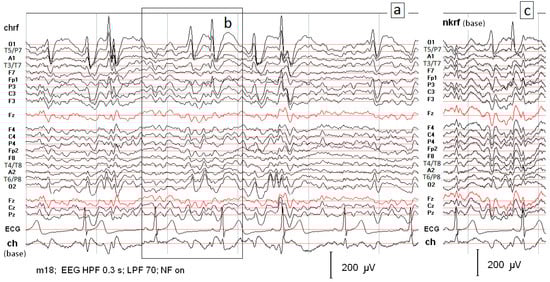 (a) Segment of the EEG record with characteristic spike–wave patterns received using the reference electrode located on the chin. The record (c) presents the same data as those illustrated in (b) but recorded using the reference electrode located at the neck.