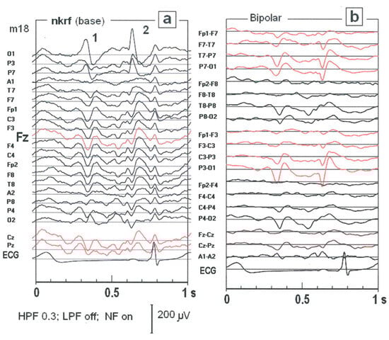 A one-second segment of the EEG record is presented in Figure 1c. Two montages are compared for the same EEG fragment: the basic montage with the reference electrode at the neck (a) and the bipolar montage (b).