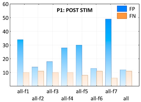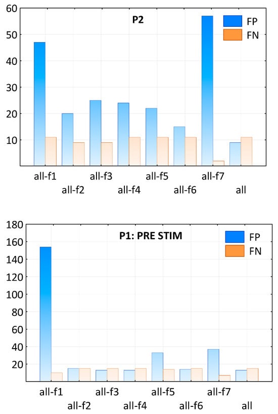 The importance of individual features in classification was tested by removing one of them from the whole set for the performance calculation. The number of FP and FN patterns resulting from classification with all features and the classification with a set without one of the features (f1–f7) in both patients and conditions is shown in Figure 5.