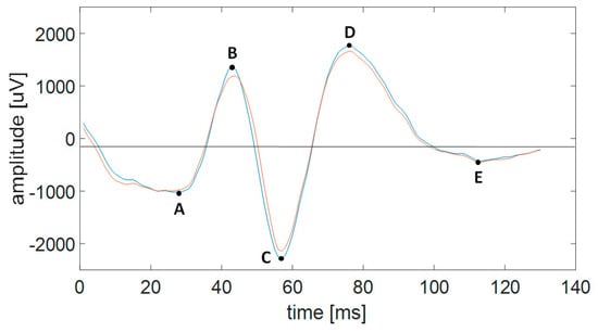 Then, the vector of non-zero differences between successive values of the product was created. The potential spikes were identified as one of the following sequences: (−22), (−21), (−12) or (−11) were found in this vector. In such a way, the positions of the successive five minimums and maximums in the SW pattern (points A–E in Figure 7) and the signal amplitudes at these positions were determined.