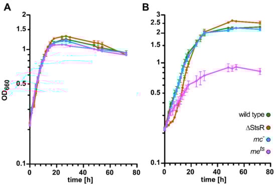 Figure 1 demonstrates the almost-identical growth for the wild type and the mutant strains under microaerobic conditions in the exponential phase (panel A). With entry into the stationary phase, differences become visible: while the ΔStsR mutant reached a higher final optical density (OD), a lower final OD was measured for the rnets mutant compared to the other strains. This is in agreement with our previous observation of higher ODs for the ΔStsR mutant in the stationary phase [].