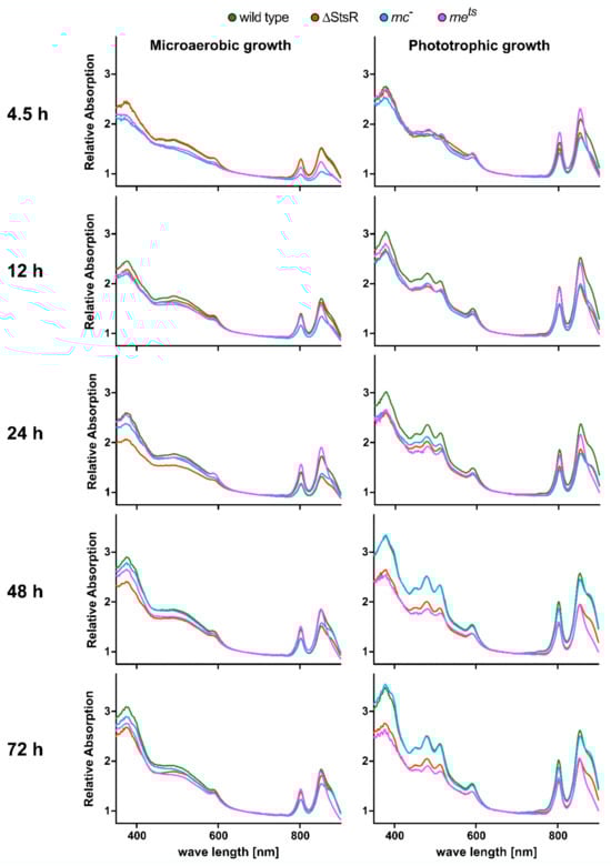 Under microaerobic conditions, the OD-normalized absorbance peaks of the wild type increased from the 4.5 h time point to the 12 h time point (in the transition from exponential to early stationary phase). At 4.5 h, both RNase mutants showed lower amounts of photosynthetic complexes, while the spectrum for the ΔStsR mutant was almost identical to that of the wild type. This can be expected since StsR shows only low expression during the exponential phase []. Northern blot analysis revealed that in stationary phase, StsR is more abundant during phototrophic growth than under microaerobic conditions in the wild type and the rnc− mutant but less abundant in the rnets mutant (Figure S1). During the later stationary phase (time points 24 h and 48 h), the ΔStsR mutant showed decreased levels of photosynthetic complexes. While the rnc− mutant showed reduced absorbance values over all time points, the rnets mutant showed comparable absorbance levels to the wild type after entering stationary phase (time points from 12 h–72 h).