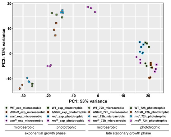 Principal component analysis of the total RNA profiling data obtained from wild type, rnets, rnc−, and ΔStsR mutants under various growth conditions. Total RNA of biological triplicates from each genotype was analyzed by RNA-seq. Cultures for RNA isolation and subsequent RNA-seq analysis were grown under microaerobic or phototrophic conditions to exponential or late stationary phase (72 h), as indicated by the symbol legend.
