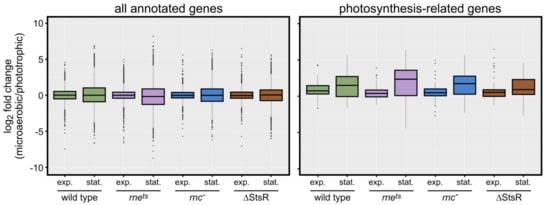 The box plots in Figure S3 show the average log2 fold changes of gene expression in the stationary phase compared to the exponential phase. The general distribution of expression changes for all genes was larger during microaerobic growth compared to phototrophic growth (median values were close to 0). Looking only at the photosynthesis-related genes, the median was shifted to negative values for all strains and conditions but not for the rnets strain during phototrophic growth (median slightly higher than 0). The spread between log2 fold change values was higher during microaerobic growth than during phototrophic growth; this difference was smaller in the rnets strain than in the other strains.