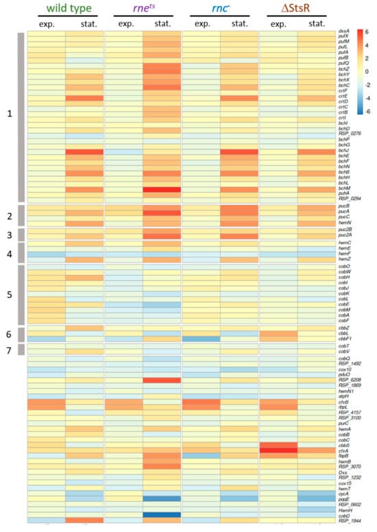 First of all, the heatmap visualizes much stronger expression changes between microaerobic and phototrophic conditions in the stationary phase compared to the exponential phase in all strains, as also revealed by the box plots. The strongest deviation from the wild type pattern is again observed for the rnets strain. Genes that are localized together on the chromosome are marked (clusters 1–7, gray bars). While some of the genes in clusters 1, 2, and 3 are known to be co-transcribed [,,], not all co-localized genes which occur in the heat map are also co-transcribed (some are not shown due to the cut-off criteria for base mean and p-value). Clusters 1–3 comprise the genes for the proteins of the photosynthetic complexes (puf and puc genes) and the genes for bacteriochlorophyll (bch) or carotenoid (crt) synthesis. The expression pattern of these genes during exponential growth was most similar between wild type and the ΔStsR strain, while the expression change in the ribonuclease mutants was stronger for most of these genes. In the stationary phase, the rnets strain showed the strongest differences to the wild type; in particular, the puf genes showed stronger expression change.