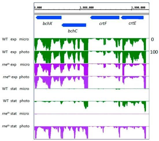 Figure 6 shows a read coverage plot for the expression of the crtE-crtF and bchC-bchX genes in the wild type and the rnets mutant.