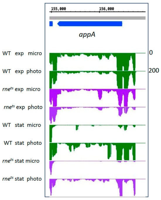 The expression pattern of the appA gene in the WT is similar to the expression of the bch and crt genes, as shown in Figure 6. In contrast to those genes, expression of appA was affected by RNase E during microaerobic and phototrophic growth. This effect is much more pronounced in the stationary phase. The effect of RNase E on the stability of the appA transcript was described previously []. Our data also reveal effects of RNase III and StsR on appA expression. For the ppsR gene, encoding the anti-repressor to AppA, we observed only minor expression changes and no strong influence of the strain backgrounds (Table 2).