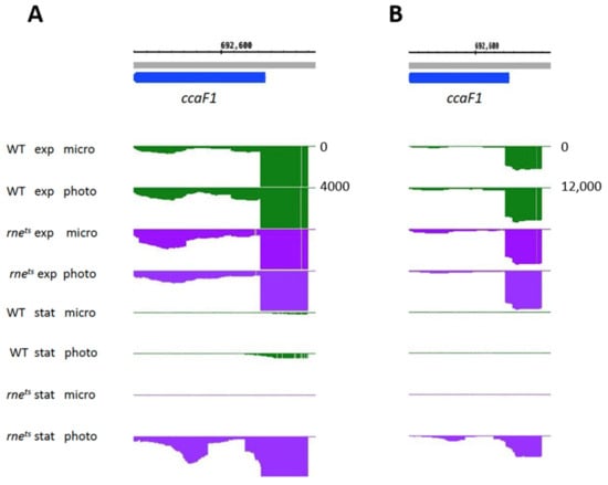 Normalized read coverage plot taken as a screenshot from the Integrated Genome Browser (IGB) showing reads for the ccaF1 in the wild type and rnets mutant. The y-axis count scale is indicated on the right side. A large scale is depicted in panel B (A: 0–4000 reads; B: 0–12,000 reads).