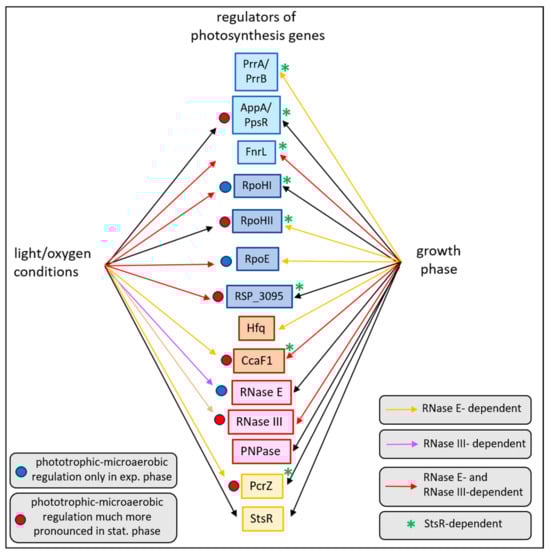 In addition, this study demonstrates the important role of RNases not only in adaptation to growth conditions but also in adaptation to growth phases. All colored arrows in Figure 10 indicate the influence of at least one RNase in regulation. All regulators shown are also influenced by StsR, underlining the central role of this sRNA in the adaptation of R. sphaeroides to environmental conditions. Studies on different bacterial systems in recent years have revealed the important role of sRNAs as key mediators in large regulatory networks in bacteria (e.g., reviewed in [,]).