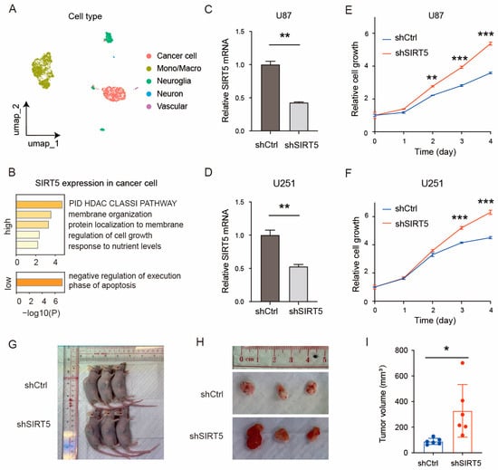 2.2. SIRT5 Knockdown Promotes GBM Cell Growth In Vitro and In Vivo