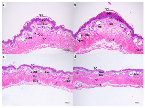 Microstructure of the chest skin of Quasipaa spinosa at different reproductive periods: (a–c) microstructure of the chest skin of males during the pre-breeding, breeding, and post-breeding periods, respectively; (d) microstructure of the chest skin of a female. SC: stratum corneum; SGl: stratum granulosum; SG: stratum germinativum; SS: stratum spongiosum; SCp: stratum compactum; MG: mucous gland; GG: granular gland; BV: blood vessel; PC: pigment cell.